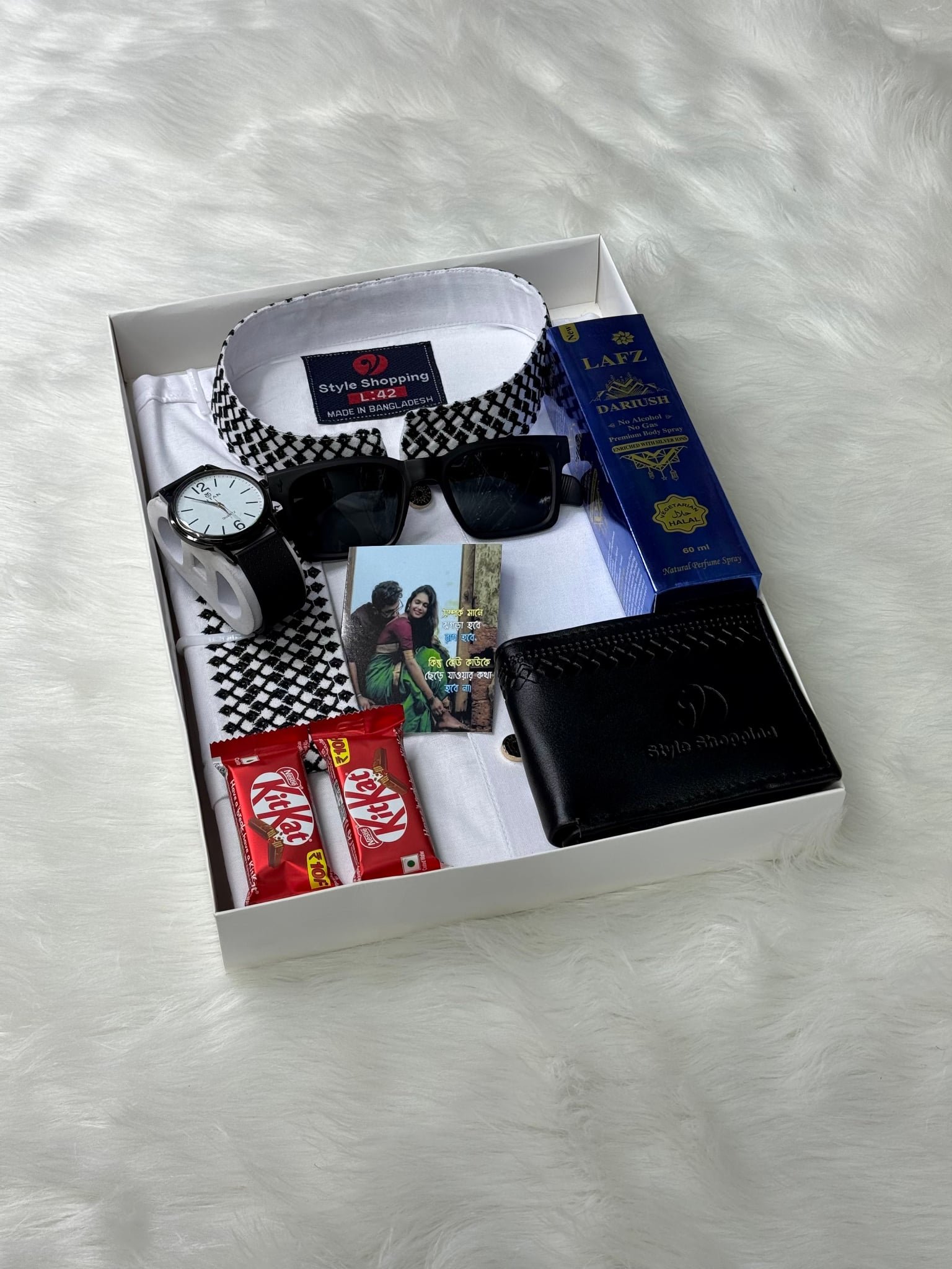 সাদা-১ কালার পাঞ্জাবী কম্বো সেট, ঘড়ি, মানিব্যাগ, পারফিউম, চশমা, চকোলেট ও চিরকুট