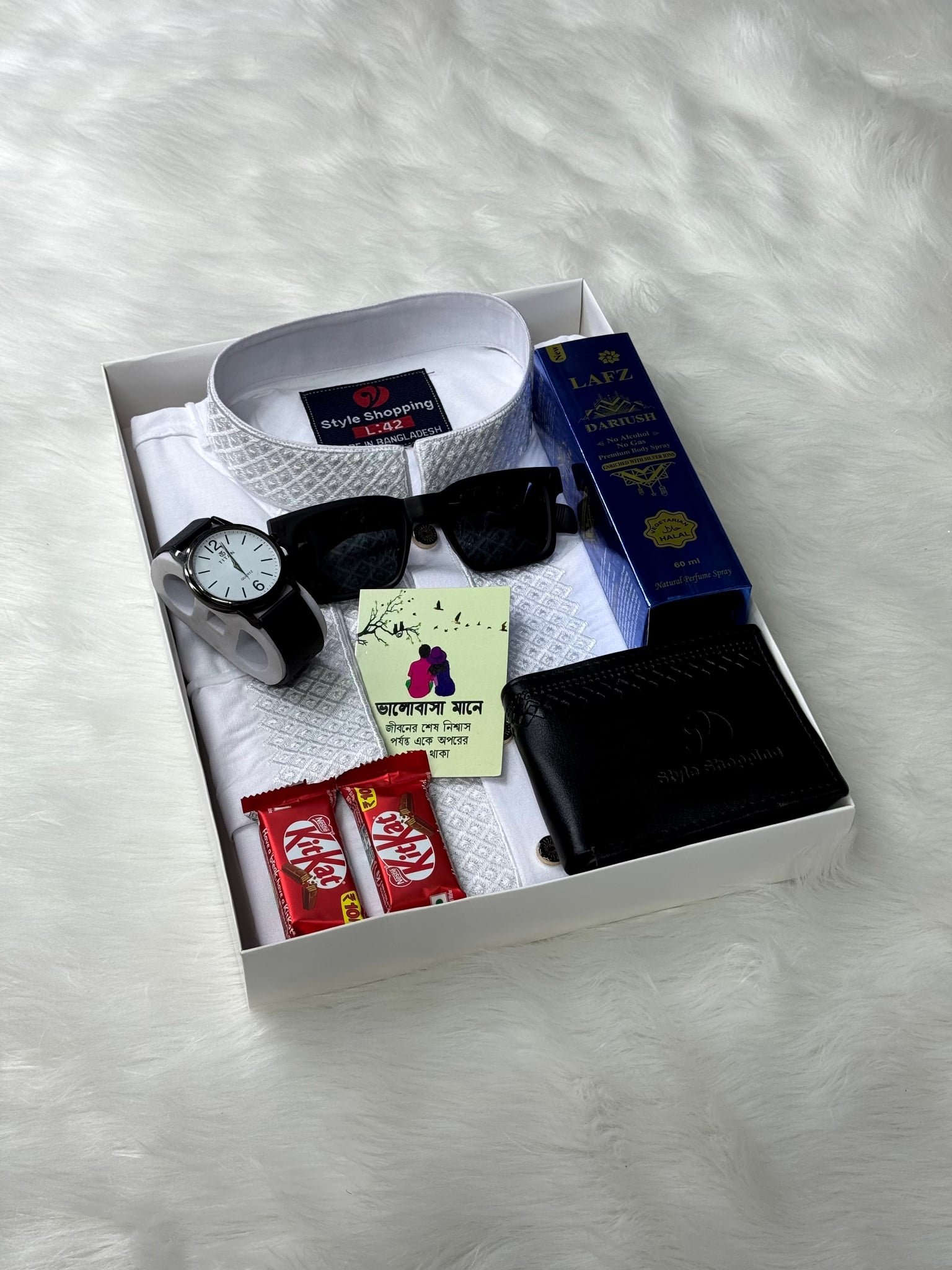 সাদা-২ কালার পাঞ্জাবী কম্বো সেট, ঘড়ি, মানিব্যাগ, পারফিউম, চশমা, চকোলেট ও চিরকুট